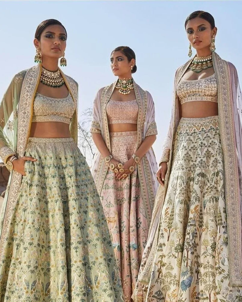Lehengas are a preferred style for young ladies, consisting of a blouse, skirt, and chunni (also called a dupatta). Similar to salwars, look for “wedding (guest)”, “festive,” or “party wear” styles. Lehengas can be found pre-stitched, but tailoring may be required to get the blouse to fit just right. The store you purchase the lehenga from may have a tailor or recommend one. The blouse and skirt are very easy to wear, and the chunni is relatively easy to drape as well - draping styles can be found online or on YouTube.